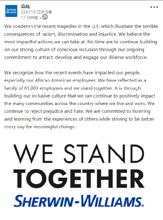 獲悉,全球涂料巨頭美國宣偉(Sherwin-Williams)今日發表聲明稱, 我們譴責最近發生在美國的悲劇,這表明了種族主義、歧視和不公正的可怕后果。我們相信,此時此刻,我們能夠采取的最有效的行動是, 通過我們持續致力于吸引、發展和調動多樣化的員工隊伍,繼續建立我們自覺包容的強大文化。