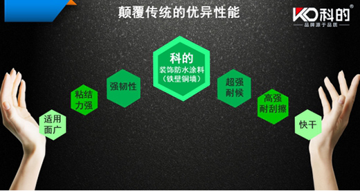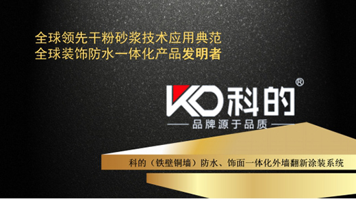為此,科的防水結合歐洲的先進技術,研發出“鐵壁銅墻裝飾、防水一體化涂料”,顛覆了傳統外墻涂料施工工藝。其六大優異性能:適用面廣、粘結力強、強韌性、超強耐候、高強耐刮擦、快干,使得防水與裝飾一次成型、一步到位,大大節省了外墻的施工時間及成本。