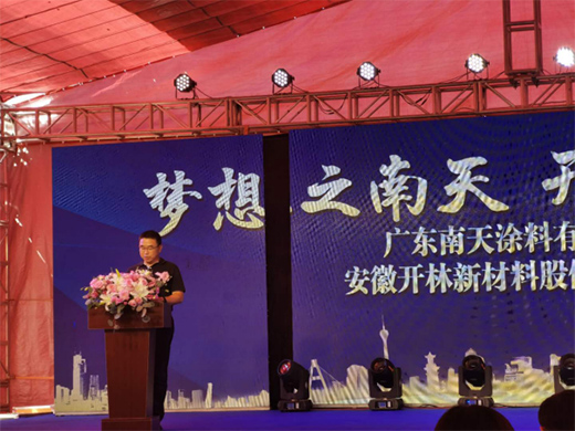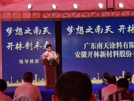 會上,天長市副市長周繼安、廣東涂料協會會長陳冰、安徽開林董事長王和山及受邀前來的當地行業領導都發表了重要講話,為華東區生產基地的未來指明了正確的方向并對其寄予了期許。隨后,天長市政協主席董學文和陳冰會長為南天涂料華東生產基地揭牌。