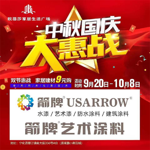 2020年9月20日-10月8日,即中秋國慶雙節假期前后,福建寧化的著名建材家居銷售點——歐蓓莎家居生活廣場特別聯合各大商家舉辦了一場福利滿滿、豪禮不斷的大惠戰活動,為寧化老百姓獻上珍貴的雙節賀禮!而箭牌漆福建寧化專賣店亦加入到了這場鉅惠盛宴中,滿懷誠意地為寧化消費者帶來超值的涂料消費體驗。