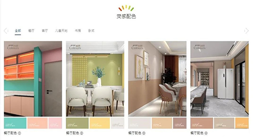 靈感配色工具擁有各類房型色彩搭配,保證時效性、不拖泥帶水的呈現室內各種不同空間的情境,提供用戶、設計師能夠快速地選擇色彩搭配方案,實現家裝色彩的一致性。