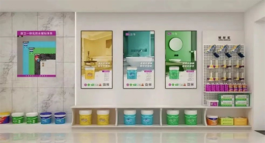 本次SI形象,重點針對一體化防水鋪貼體系以及全屋縫隙美化系統進行升級。分區域展示,又合二為一。在一體化防水鋪貼方面,除了多種施工工具的展示外,還有最新的桶裝物料陳列,以室內瓷磚鋪貼環境為背景,運用色彩搭配,提升視覺感受,破解底面鋪貼等多重困難。在全屋縫隙美化方面,針對衛生間、廚房、客廳、陽光房等應用環境,通過產品創新和應用系統研究,打造全屋縫隙美化系統,徹底解決瓷磚縫隙發黑發霉,滲水脫落等問題,為消費者打造安全舒適的家居環境。