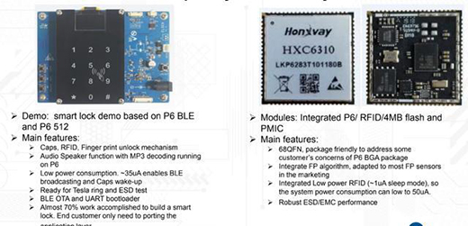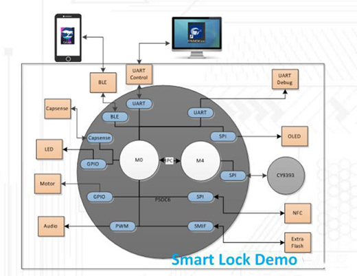 據介紹,該方案有如下特點,在系統功能上支持多種解鎖方式如指紋,密碼,BLE和NFC卡等,而且是高度集成的,它集成了。BLE、電容觸摸、加密、指紋匹配算法(Yoyon)、音頻播放、,OLED驅動功能等,指紋識別方面可以支持100個指紋注冊,匹配時間可以完成<1s @ 100指。支持兩種通訊工具(BLE和UART)用于調試FP功能。在其內部,CM0 +內核用于運行智能電子鎖應用程序代碼,CM4內核用于運行匹配器。