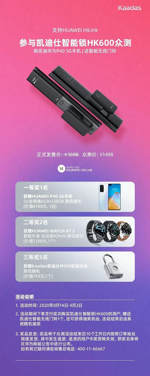 8月14日-9月2日活動期間,凱迪仕HK600智能鎖原價1698元,眾測首發(fā)價1498元,下單購買即贈送凱迪仕智能無線門鈴,眾測期間,還有機會獲得驚喜好禮!凡在華為商城購買凱迪仕HK600智能鎖的伙伴們,均有機會抽取華為P40 5G手機、HUAWEI WATCH GT 2智能手表、凱迪仕M100智能掛鎖。禮品多多,不可錯過哦~