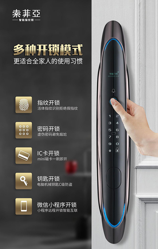 傳統的鎖具,是一種需用鑰匙打開的機械鎖,這種鎖具防盜技術較低、鑰匙容易丟失甚至被復制、易出現因忘帶鑰匙而造成的生活不便。而以索菲亞指紋鎖為代表的智能鎖,則很好地解決了傳統機械鎖的弊端。