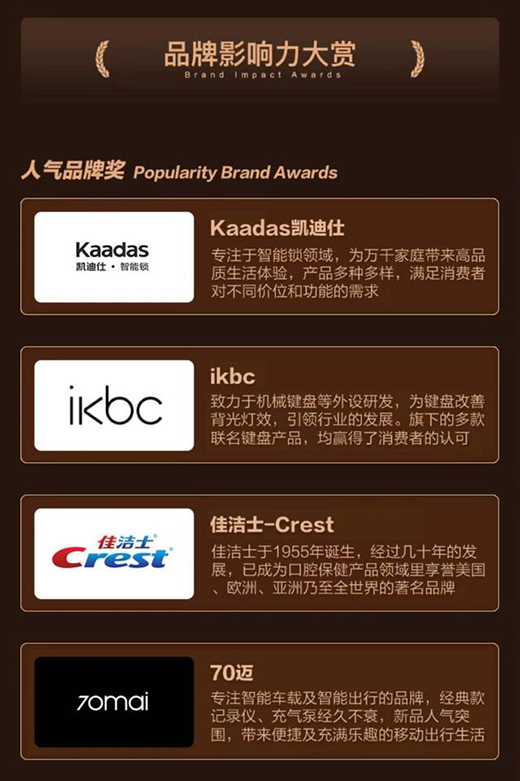在榜單上,可以看到,我們可以看見,凱迪仕K20 Pro貓眼視屏智能鎖與華為、松下、OPPO、ViVO等知名品牌好物共同上榜,成為唯一入選的智能門鎖品牌。也驗證了凱迪仕深得消費者認可和偏愛。