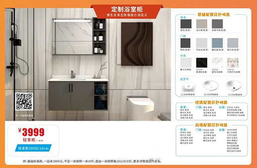 愛生活,有主張,做自己,自定義。活動期間,浪鯨衛浴推出簡約輕奢款定制浴室柜,優惠好價3999元起,為不同需求的消費人群貼心提供基礎、經濟、高端,三種定制計劃,按需選購個性定制,省心省力煥新潮衛。