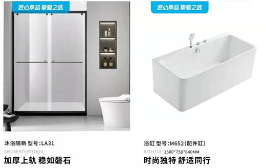 # 自潔坐便器 #強勁沖力,帶來高效潔凈;# 輕奢花灑 #高端雅致,雨淋水般的酣暢淋浴;# 淋浴隔斷 #堅固材質,帶來安心洗浴;# 時尚浴缸 #隨時隨地舒適泡澡。