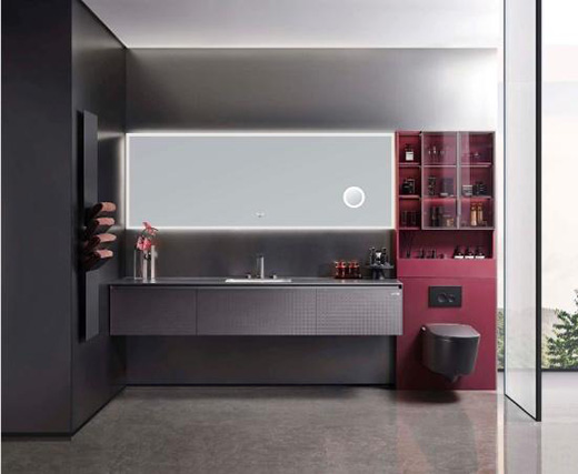歐派衛浴“魅力伯爵”系列,選擇極簡門型的深灰色立體紋巖板,搭配魅惑紅啞光烤漆格柜,迸發沉穩內斂與熱情狂放的劇烈碰撞,帶來更突出的視覺沖擊感與設計高級感。一字型布局設計搭配門板與拉手的一體化設計,從整體到細節一致實現簡約質感,明暗相間的肌理以及錯落有致的布局都在簡約感中加入協調的富于層次感的多元化設計元素,顯得更為精致。