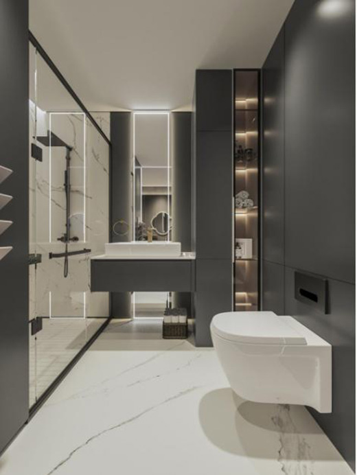 與“魅影伯爵”相對應,主要目標消費人群面向四十歲左右都市精英女性的“全能女王”通過仿科技木皮飾面搭配鱷魚皮紋,低調奢華的魅力滿溢而出?!叭芘酢蓖w采用極簡設計,一體化布局與到頂式設計,讓衛浴空間顯得更為大氣而飽滿,提升了布局格調。浴室柜采用咖色搭配米色,再加以香檳金點綴,極富輕奢高級感的配色帶來了更具消費特色傾向的衛浴空間。