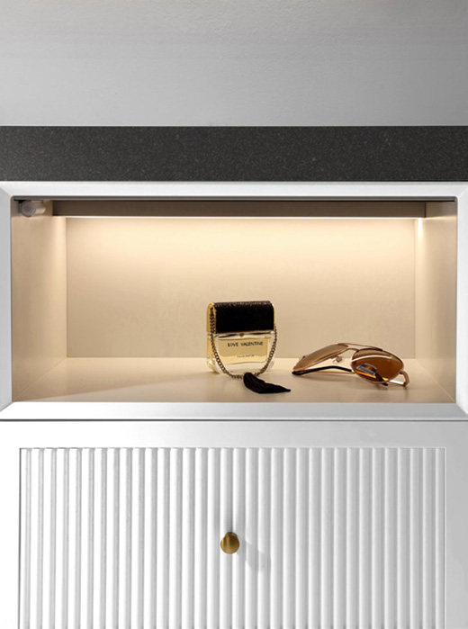開放式儲物格,內嵌感應燈帶,于冷靜的白灰空間,注入活潑的暖色燈光作為點綴,在增加觀賞性的同時提高生活效率,豐富空間層次,帶來個性的情緒表達。