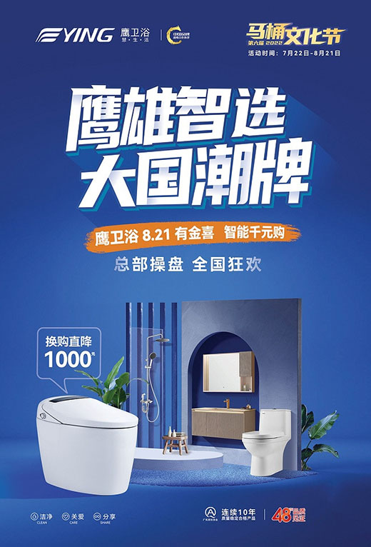 這個(gè)夏天,以感恩與關(guān)愛(ài)為初心的鷹衛(wèi)浴第六屆馬桶文化節(jié)即將在全國(guó)門店拉開帷幕,這次活動(dòng),鷹衛(wèi)浴攜智能、健康、新潮的衛(wèi)浴產(chǎn)品與誠(chéng)意滿滿的優(yōu)惠力度回饋用戶,敬請(qǐng)期待!