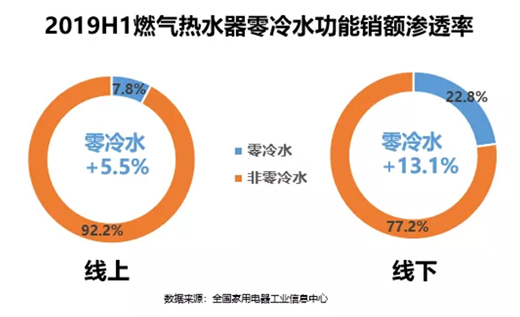為了解決產品的這個痛點,2017年市面上開始出現了以“零冷水”為賣點的產品。“零冷水”熱水器的工作原理是通過循環泵和單向閥把家里的水路循環起來,讓熱水器加熱后的水在管道中流動,從而實現出水即熱水的效果。2019年零冷水熱水器產品出現了兩大新趨勢——價位下探和容積數增大,價位從去年同期的均價5000-6000元,到今年3500-4000元的價位段成為主流。同時無論是線上還是線下,帶零冷水功能的產品出水量基本都在16L以上。價位和容積的“一下一上”趨勢,說明零冷水的功能在加速滲透與普及。這也是熱水器的“熱”的本質功能的一個體現。