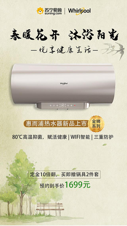 每個人在生活中都會有特別在意、特別講究的方面,并愿意為此付出更多的時間和精力,比如美食、美妝、高達、拼圖、手辦以及等等能為人們帶來愉悅的事情。而最近,全民的注意力都聚焦在了"健康"上,"好好保護自己"成了生活的主基調,那么與健康息息相關的洗澡大事豈能將就?"百年創新 悅享健康"的惠而浦為了給用戶更極致的健康呵護,推出金獅系列電熱水器,80℃高溫抑菌、三重安防,全面賦活健康沐浴。還有更令健康達人們驚喜的消息,預約新品即可享定金10倍翻、買即贈鍋具兩件套、掃碼立減等超級福利,當真是沐了,又慕了!