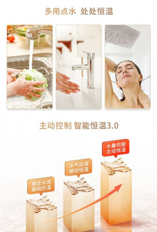 針對(duì)多點(diǎn)同時(shí)用水情況下,傳統(tǒng)熱水器的恒溫效果差問(wèn)題。E4將記憶合金水控組件升級(jí)為水量伺服器,變被動(dòng)調(diào)控為主動(dòng)調(diào)控,通過(guò)細(xì)膩調(diào)控進(jìn)出水量,有效規(guī)避水壓、水量等環(huán)境因素變化帶來(lái)的干擾,在家庭多處同時(shí)用水的情況下,也能維持各出水點(diǎn)溫度穩(wěn)定。它還采用了旁通混水降溫技術(shù),可以將短暫關(guān)水再開(kāi)的水溫上升幅度控制在小范圍內(nèi),以避免燙傷風(fēng)險(xiǎn)。通過(guò)上述各項(xiàng)功能,E4讓消費(fèi)者在使用過(guò)程中幾乎感受不到水溫的變化,享受到“0”溫差感的舒適沐浴體驗(yàn)。