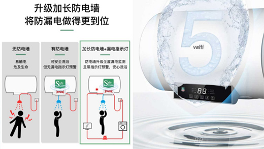 不必憂心!華帝這款電熱水器升級加長型防電墻,在人體與水之間增大電阻,即使不拔插頭,也能邊洗邊加熱,孩子獨自洗澡也可以放心。防電墻不僅升級全屋漏電系統,還可以實時監控電路,主動保護,且帶指示燈預警,讓家人沐浴更放心。