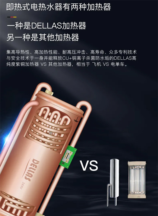眾所周知即熱式電熱水器都是馬上開馬上就能有熱水使用,不像儲水式電熱水器需要等半個小時一個小時。Dellas德而樂施的即熱式熱水器比起一般的即熱式電熱水器,加熱時間更精準,加熱效率更快。原因在于我們熱水器的加熱器采用純紫銅的材質,導熱性能特別好,熱轉化效率非常高。加熱杯也不需要像儲水式電熱水器那樣要經常清洗。