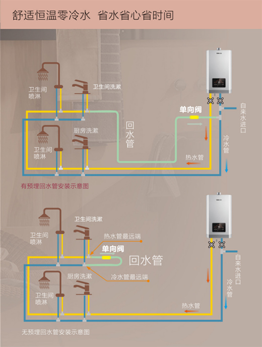 YORK約克燃氣熱水器YK-F10內置智能循環熱水系統,當它運轉時,就好比一個搬運工,將熱水管內的冷水從回水管“搬”到熱水器內進行循環預熱,使熱水管里的水始終保持溫熱狀態,從而實現即開即熱的零冷水沐浴體驗。用戶還可隨心切換即熱、預熱、巡航、通用四種模式。配備兩種管路安裝方式,可供衛浴間噴淋、廚房洗漱等多通路用水。