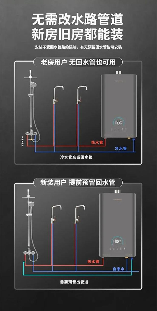 HX221A零冷水熱水器突破房屋管道布局限制,新房老房均可安裝,讓您無需擔憂安裝難題。新房裝修可以提前預埋回水管,使全屋做到零冷水、零等待;而老房想要換新機,也無需改造水管線路,只需在離熱水器最遠的浴室加裝單向閥,即可實現全屋零冷水效果。