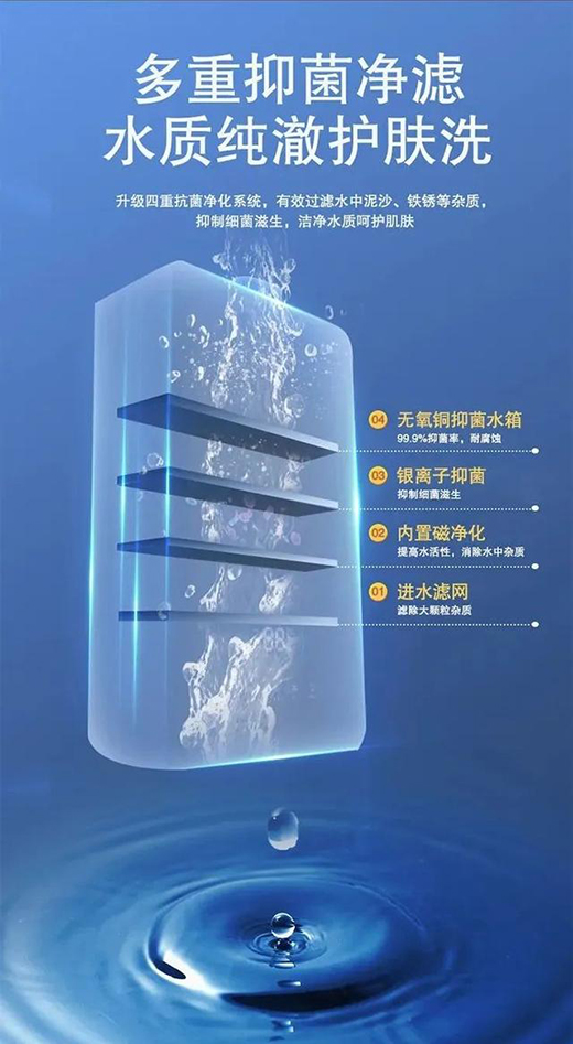 熱水器HX221A搭載四重凈水抑菌系統,不僅層層過濾攔截水中雜質,還對水質進行高效滅菌抑菌處理,還原潔凈水質,呵護肌膚健康,為皮膚敏感人群、年幼寶寶、孕婦等筑起凈浴健康保護墻,同時降低不良水質對熱水器的影響,延長使用壽命。