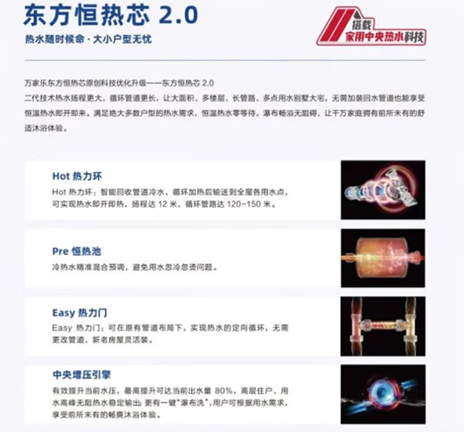 “東方恒熱芯1.0”專利核心技術(shù),具備Hot熱力環(huán)、Pre恒熱池、Easy熱力門、iCloud控制云四大核心功能。其中,Hot熱力環(huán)可智能回收管道中的冷水,加熱后再次輸送到每個(gè)用水點(diǎn),滿足了全屋熱水流動(dòng)需求;而Pre恒熱池混水技術(shù),具備熱水集中混合再輸出功能,可以使溫度波動(dòng)始終保持在±0.1℃的恒溫狀態(tài);Easy熱力門技術(shù),專為無回水管路的環(huán)境而研發(fā),方便用戶改造及安裝需求。搭載“東方恒熱芯1.0”技術(shù)的中央熱水燃?xì)鉄崴鱔7的推出,讓整個(gè)行業(yè)看到了萬家樂在熱水領(lǐng)域的創(chuàng)新突破。