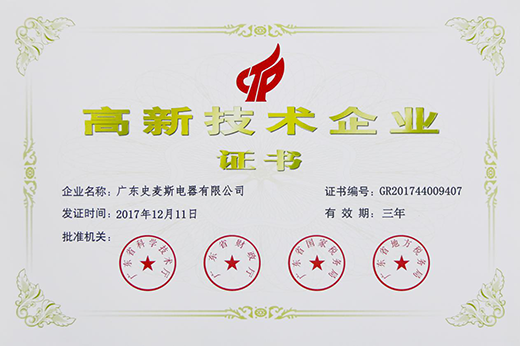 2017年在全體員工的共同努力下,經過嚴格的層層審核,史麥斯電器實力榮膺由廣東省科學技術廳、廣東省財政廳、廣東省國家稅務局、廣東省地方稅務局所頒發的“高新技術企業”證書。高新技術企業的認定,是對核心自主知識產權、科技成果轉化能力、研究開發的管理組織水平、成長性指標等進行綜合性的評審。