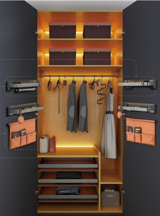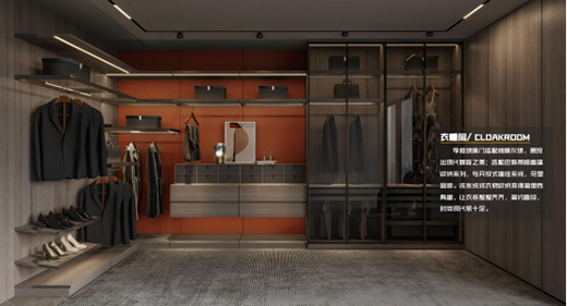 簡·愛保羅的衣柜精確把握年輕群體的消費心理,以擁有高級質(zhì)感的中性灰作為主調(diào),輔以愛馬仕橙與金屬色作搭配。在簡·愛保羅設(shè)計師的手下,安靜的中性灰遇到耀眼的愛馬仕橙,打破原本傳統(tǒng)陰郁的空間氛圍,為單調(diào)的空間注入了新鮮活力,演繹出時尚經(jīng)典的別樣輕奢,最大程度地發(fā)揮衣柜的時尚魅力,給人以絢麗時尚的視覺觀感。
