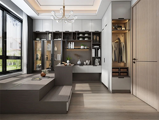 如果房間空間足夠大的話,還可以在這里安裝一個(gè)升降式榻榻米,可以大大提高空間利用率。升降器升起時(shí),榻榻米就是一個(gè)休閑區(qū),可以和好友在這兒聊天、喝茶、打牌,底部空間還可以收納不常用的雜物。升降器降下時(shí),只需在上面鋪一層軟墊或棉絮,再放上被子和枕頭,就代替床來(lái)使用,方便親朋好友留宿,實(shí)用性非常強(qiáng)。