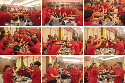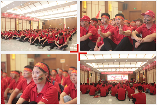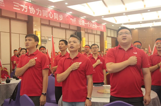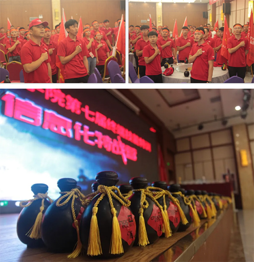 同時(shí),推廣部部長肖輝健在現(xiàn)場正式啟動(dòng)超人七月全國聯(lián)動(dòng)活動(dòng),全國各地經(jīng)銷商通過線上視頻參加啟動(dòng)會(huì)議,各終端門店店長簽訂軍令狀,齊喝壯行酒,定下“20天沖刺兩千萬”的銷售目標(biāo)。