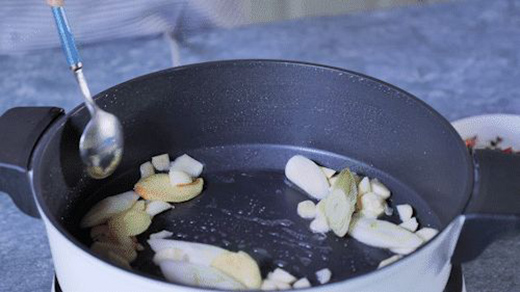 5、另起鍋,加入姜蒜蔥、50g干辣椒和15g花椒爆香,加入4勺郫縣豆瓣醬和洋蔥炒出紅油;