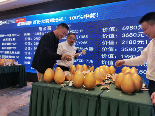 亮點滿滿的優惠政策一經公布,再次將現場的熱烈氣氛推向新高度。透過經銷商發自內心的肯定與滿臉的喜悅之情,我們能看出眾人心中已經有了要下單訂貨的強烈欲望,這也正為接下來的下單打款環節奠定下基礎。而為感恩各位經銷商的下單支持,銀田還特意準備了砸金蛋環節,將集成灶、煙機、熱水器等豪華大禮傾情相送。