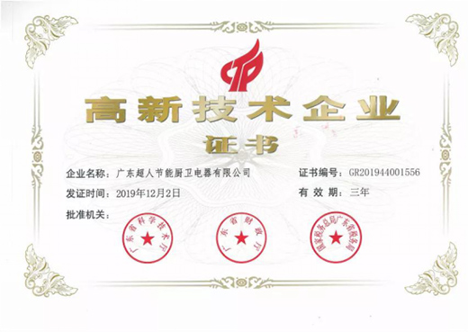 廣東超人節(jié)能廚衛(wèi)電器有限公司在2020年再次被授予“高新技術(shù)企業(yè)”稱號,證書編號為GR201944001556。從2009年開始,超人已經(jīng)連續(xù)十二年被認(rèn)證為高新技術(shù)企業(yè)。