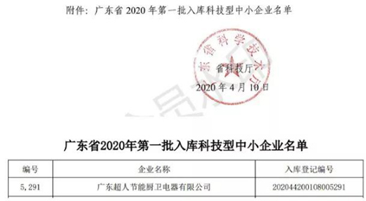 根據(jù)《科技型中小企業(yè)評價(jià)辦法》(國科發(fā)政[2017]115號)和《科技型中小企業(yè)評價(jià)工作指引》(國科火字[2017]144號)要求,2020年4月10日,廣東省科學(xué)技術(shù)廳公布了2020年第一批入庫科技型中小企業(yè)名單,經(jīng)過公示認(rèn)證,廣東超人節(jié)能廚衛(wèi)電器有限公司入庫廣東省第一批科技型中小企業(yè),入庫登記編號202044200108005291。