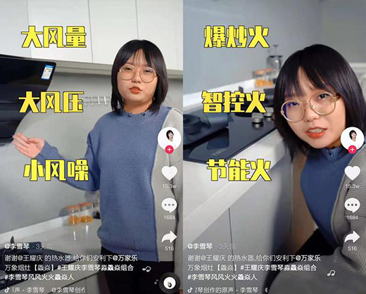 “我說你光送熱水器哪行啊,要送就得送全套啊!”李雪琴化身“飍焱人”,繼續(xù)安排上了油煙機【飍】和燃氣灶【焱】,“大風(fēng)量、大風(fēng)壓、小風(fēng)噪,瞬吸不留煙;爆炒火、智控火、節(jié)能火,做飯?zhí)貏e香。”
