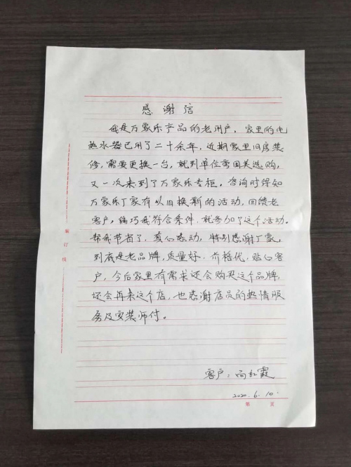 向來(lái)重視服務(wù)的萬(wàn)家樂(lè)的眾多暖心活動(dòng),得到了新老用戶的一致認(rèn)可,眾多享受萬(wàn)家樂(lè)貼心品質(zhì)和服務(wù)的用戶紛紛發(fā)來(lái)感謝信,感謝萬(wàn)家樂(lè)陪伴度過(guò)的這幾十載春秋歲月。而萬(wàn)家樂(lè)也在家電讓家更溫暖的活動(dòng)中獲得了大型社會(huì)公益活動(dòng)示范企業(yè)的稱號(hào)。