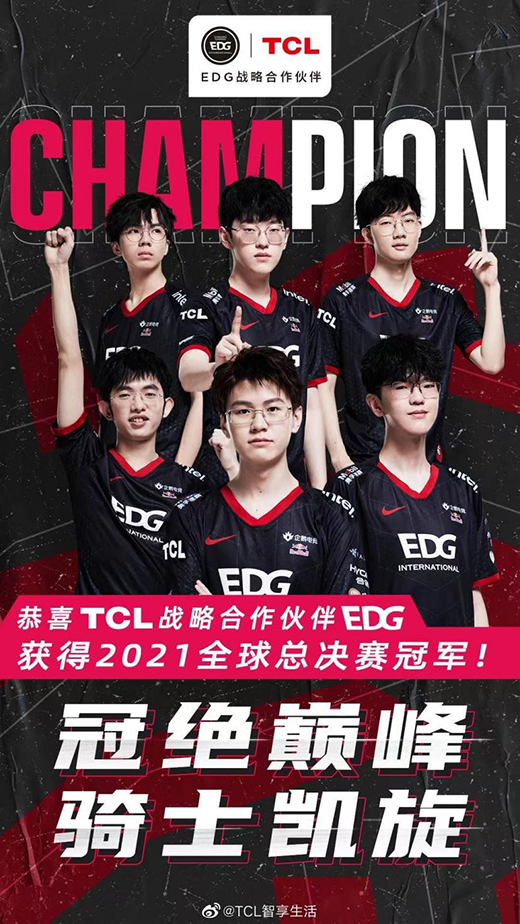 2021英雄聯(lián)盟全球總決賽圓滿結束,EDG拿到了世界冠軍。作為EDG的戰(zhàn)略合作伙伴,TCL 的成長歷程和EDG有著許多相似之處,TCL從1981年品牌誕生到如今業(yè)務遍及全球160多個國家和地區(qū),每走一步都要在不斷創(chuàng)新中脫穎而出,最終成為全球第一的中國品牌。