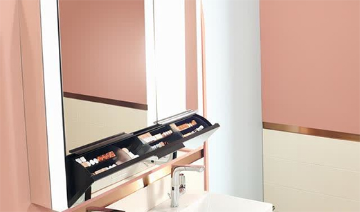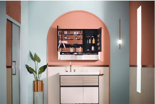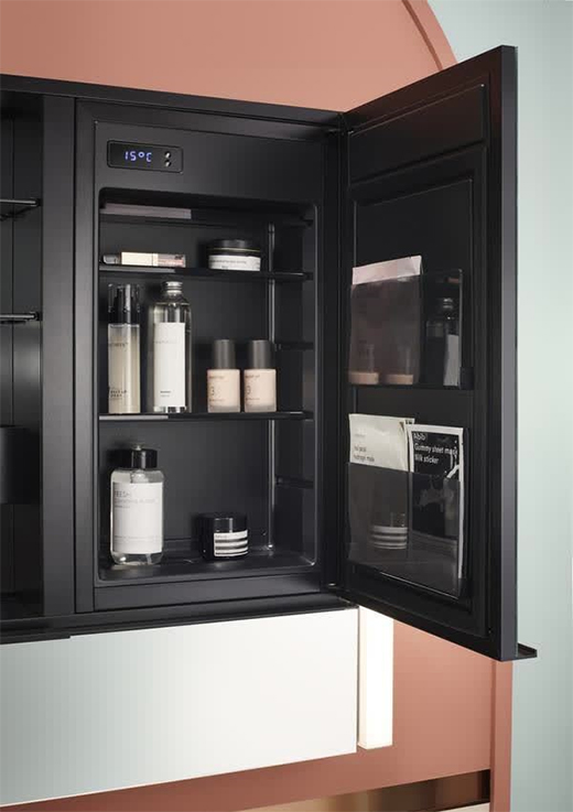 值得一提的是,鏡柜還有內置“美妝冰箱”,不同季節可以按需調控溫度,這個設計可以說是很人性化了。此外,鏡柜下方的便捷式翻抽空間以透明隔層合理分隔成若干個分區,大小形狀不一的彩妝用品均可整齊排列,可作為“口紅吧”收納約100支口紅。