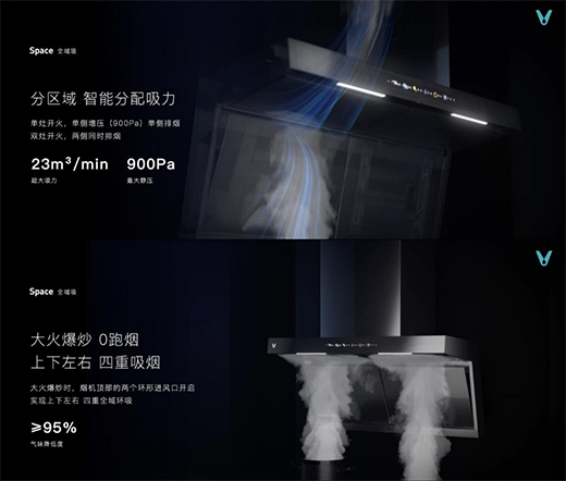 ?油煙是危害廚間生活健康的一大元兇,一臺好的油煙機是現代智能廚房不可或缺的重要成員。云米此次推出的高端新品Space 云米AI智目油煙機,從超音速戰斗機F22的發動引擎獲得研發靈感,顛覆傳統吸煙原理,左邊開火左邊吸,右邊開火右邊吸,兩邊開火同時吸,讓油煙無處可逃。