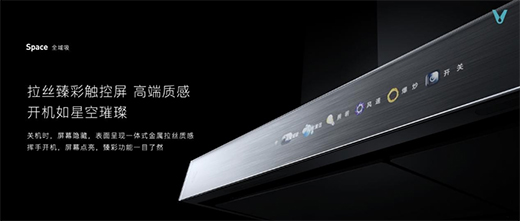 ?設計上,Space 云米AI智目油煙機采用拉絲臻彩觸控屏,精致外形體現對美好廚房的生活追求。關機時,屏幕隱藏,表面呈現?體式金屬拉絲質感。揮手開機,屏幕點亮,如星空璀璨,臻彩功能一目了然。