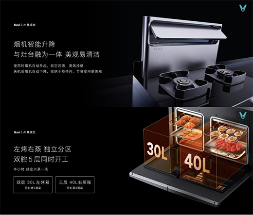 ?Navi 3云米AI集成灶,煙機智能升降,與灶臺融為一體,美觀易清潔。使用時,煙機自動升起,低空近吸,高效排煙。關機后,煙機自動下降,收納于柜體內,節省空間,美觀大氣。左烤右蒸灶臺設計,獨立分區,雙腔5層同時開工,30分鐘輕松搞定六菜?湯,為都市白領在忙碌的生活節奏中提供便利,更好地做到工作生活兩不誤。