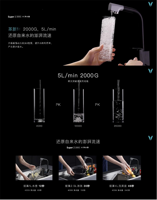 ?Super2 2000G云水·泉先AI凈水器以2000G滂湃海量,升級超強動力雙頭 8 腔泵,提升水的利用率,產出更少廢水,讓流速時間更快:以12秒接滿1L水壺;30秒接滿2.5L湯壺;48秒接滿4L洗菜盆的驚人速度,解決傳統凈水器出水量小、時間久等問題。