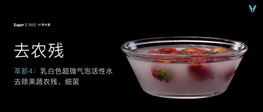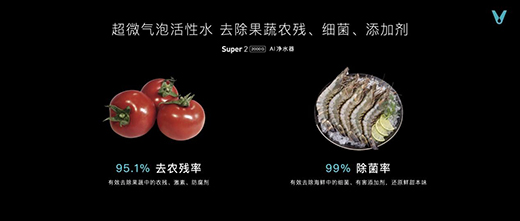 ?Super2 2000G云米·泉先AI凈水器不僅在清洗果蔬時能達到95.1%去農殘率,有效去除果蔬中的農殘、激素、防腐劑;在清洗海鮮時,更能達到99%除菌率有效去除海鮮中的細菌、有害添加劑,還原鮮甜本味。Super 2更采用炫彩大屏雙出水龍頭用水量、水質實時看得見,讓消費者不僅可以用得放心,更能吃得安心。