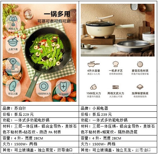 實際上,相對于大家電產品,小家電產品往往技術門檻較低,導致行業同質化嚴重。同一類小家電產品,功能和外觀往往大同小異,不同品牌很難做出區分。《每日財報》對比小熊電器和蘇泊爾旗下一體式電炒鍋后,發現兩款產品功能、材料、火力、大小容量基本一致,連售價也相差不大。