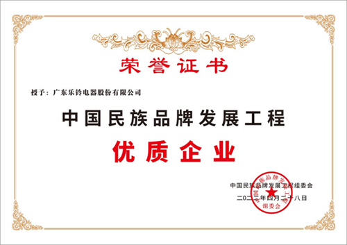 - 祝賀樂鈴廚電榮膺中國民族品牌發展工程——