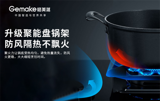 格美淇鴛鴦灶采用聚能盤防風設計,有效阻隔廚房各個角落吹來的風對火焰的影響,穩定火焰,提高燃燒效率,節能省氣,還能有效圈住熱量聚集鍋底,減少熱量外溢;同時搭配X型鍋架設計,讓鍋底均勻受力,抓鍋穩固不滑鍋,讓烹飪更加得心應手。
