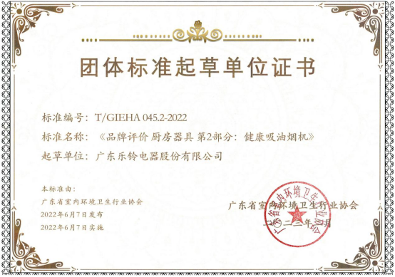 2023年,樂鈴憑借著在廚房電器領域內吸油煙機和集成灶對廚房油煙難關的攻克,參與《健康吸油煙機》、《健康集成灶》等團體標準的制定,推動行業的健康升級,守護億萬家庭的呼吸健康。