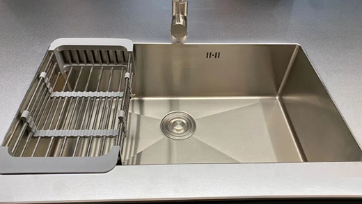不銹鋼廚柜采用一體式出產,像不銹鋼臺面與水槽以及不銹鋼柜體板都是一體成型工藝制造而成,不易產生霉菌,更加干凈衛生。