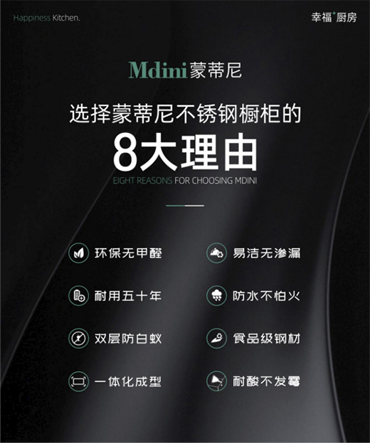 蒙蒂尼不銹鋼櫥柜具備以下八大優勢,絕對是您的最佳之選,讓您從踏進廚房的那一刻起,手與櫥柜觸碰的瞬間,烹飪的樂趣、健康的生活也從這一刻開始。