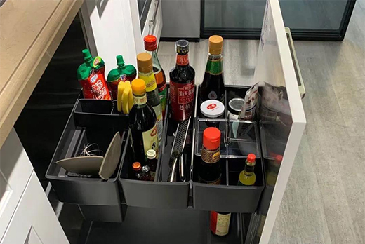 廚柜選用優質五金配件,不管是抽屜滑軌,還是柜門鉸鏈,都能輕松順暢開合。吊柜、地柜以及高柜內部均可貼心定制適合的拉籃、隔板、置物架等收納系統,讓廚房物品都能找到自己的棲身之所,且方便找尋。