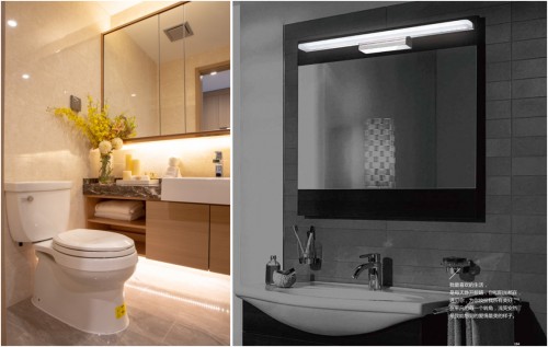 衛(wèi)生間雖小,燈光設(shè)置可是大有名堂。燈光設(shè)置不合理,在鏡子前人臉會(huì)出現(xiàn)陰影,不方便化妝、刮胡子等。避免這樣的情況,可在鏡前區(qū)增加鏡前照明,讓光源均勻打在臉上。鏡柜下方放置洗浴用品的位置,同樣可以增設(shè)燈帶。